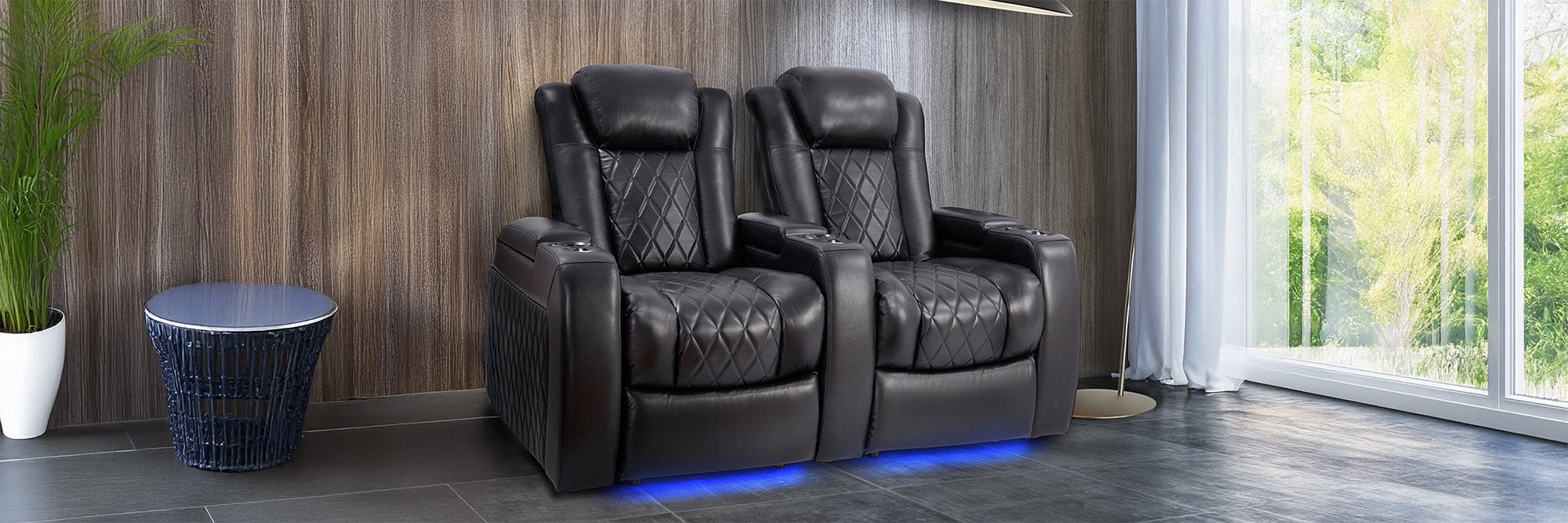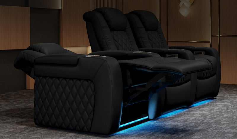 Stylish black chrome cupholders enhance your seating with a refined, modern touch—functional elegance for every movie night.