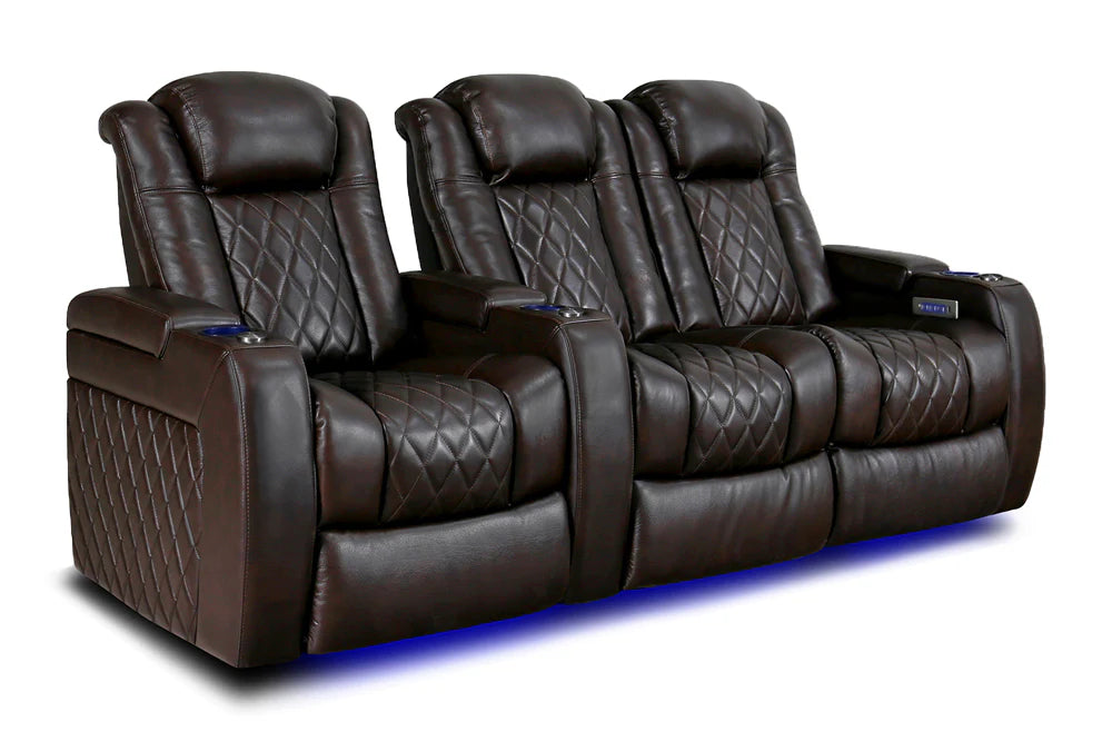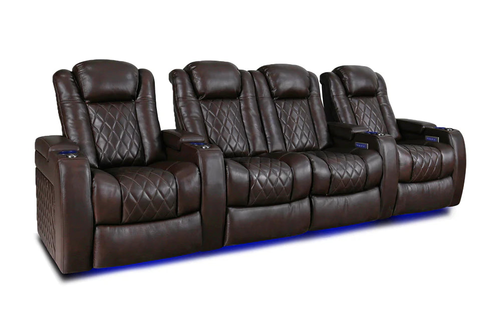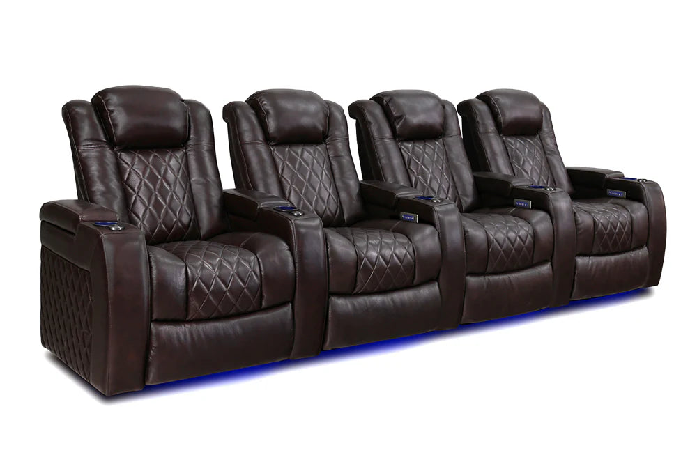 Introducing the 2025 Version of Our Best-Selling Tuscany Home Theater Seating! Upgrade your home theater with the brand new Tuscany 2025 with upgraded technology and cutting-edge comfort, A perfect blend of luxury, style, and comfort. Designed for unmatched relaxation, this premium recliner is crafted with new imported Top-Grain Italian Nappa leather 11000 on all seating surfaces, offering a smooth and elegant touch. Enjoy immersive movie nights with new RGB cup holders with ambient base lighting, and a motorized reclining system that lets you find your perfect seating position effortlessly. The newly upgraded Tuscany now features deeper hidden arm storage, perfect for keeping your accessories close at hand. Plus, an air piston-assisted storage lid ensures smooth and safe operation. Our tactile button control system replaces traditional soft-touch buttons, allowing you to activate all functions simultaneously for an enhanced experience.