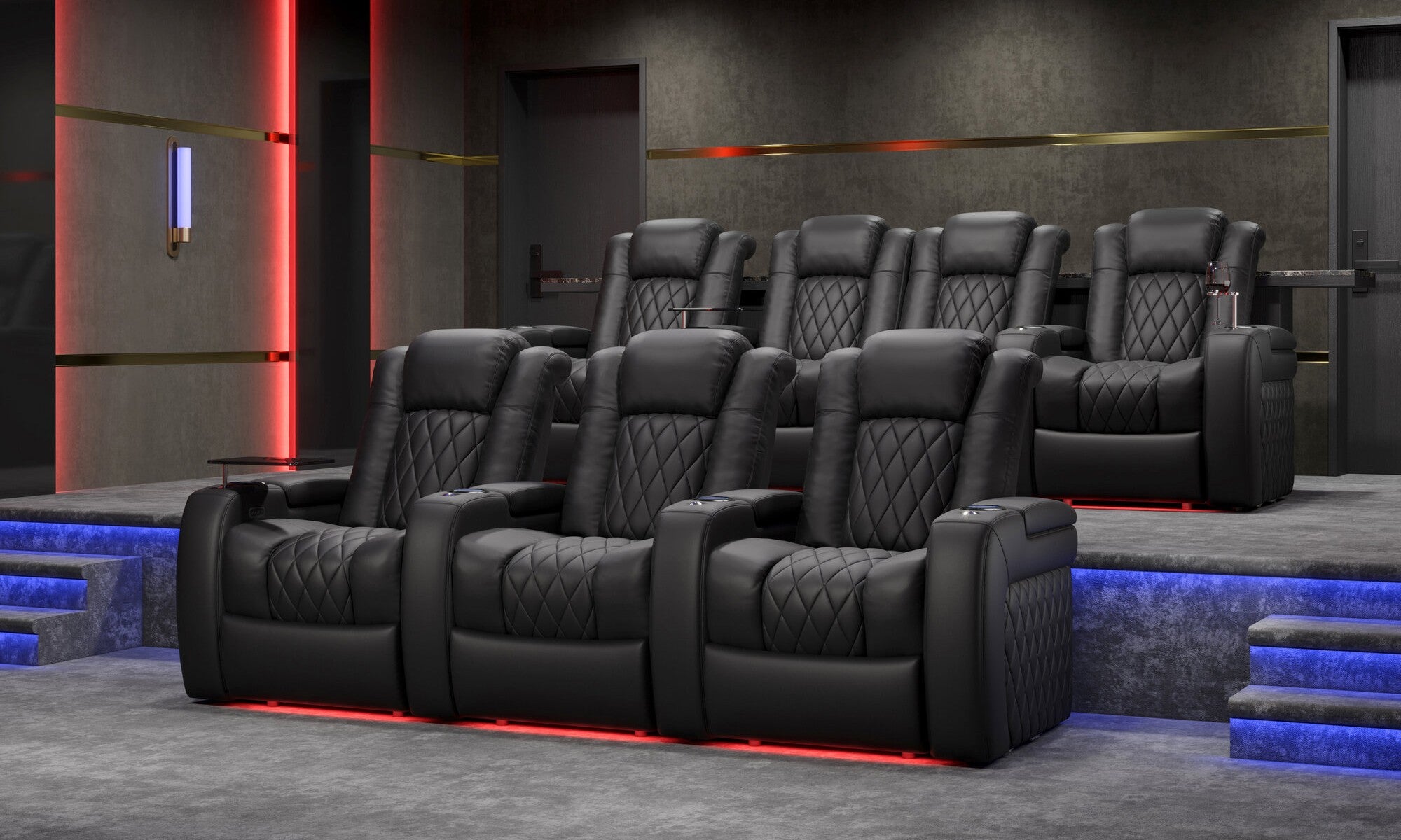 Introducing the 2025 Version of Our Best-Selling Tuscany Home Theater Seating! Upgrade your home theater with the brand new Tuscany 2025 with upgraded technology and cutting-edge comfort, A perfect blend of luxury, style, and comfort. Designed for unmatched relaxation, this premium recliner is crafted with new imported Italian Nappa 11,000 Top Grain Leather on all seating surfaces, offering a smooth and elegant touch. Enjoy immersive movie nights with new RGB cup holders with ambient base lighting, and a motorized reclining system that lets you find your perfect seating position effortlessly. The newly upgraded Tuscany now features deeper hidden arm storage, perfect for keeping your accessories close at hand. Plus, an air piston-assisted storage lid ensures smooth and safe operation. Our tactile button control system replaces traditional soft-touch buttons, allowing you to activate all functions simultaneously for an enhanced experience.