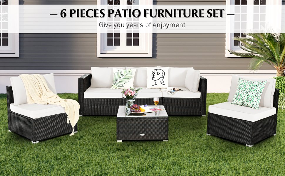 6 Pieces Patio Rattan Furniture Set with Cushions and Glass Coffee Table