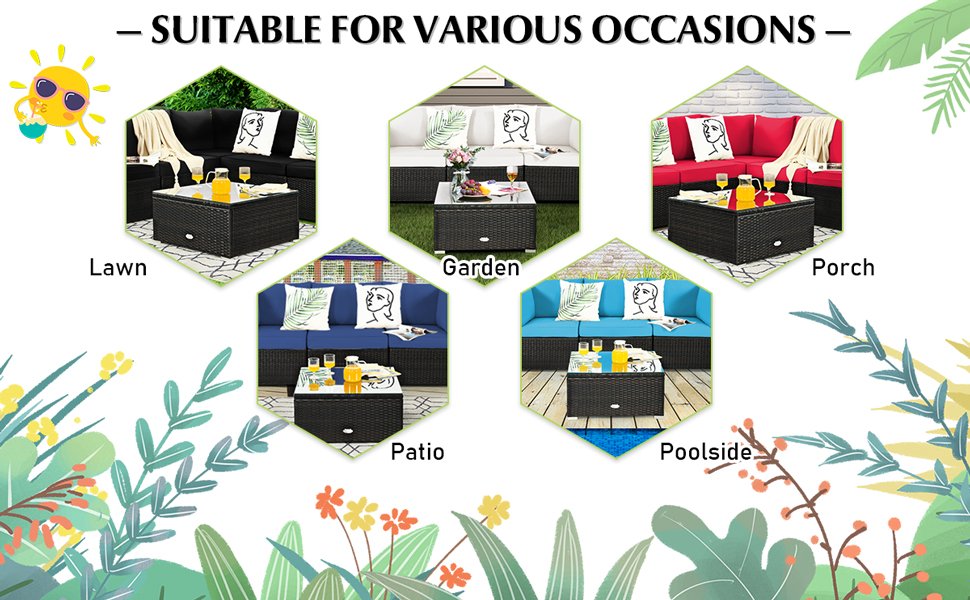 ● Free Combination for Wide Uses: The patio sofa set includes 2 armless sofas, 2 corner sofas, and 1 coffee table so that you can freely combine them according to your needs and room space. This sectional conversation sofa set can be used both indoors and outdoors, which is suitable for the living room, patio, garden, balcony, yard, and more.