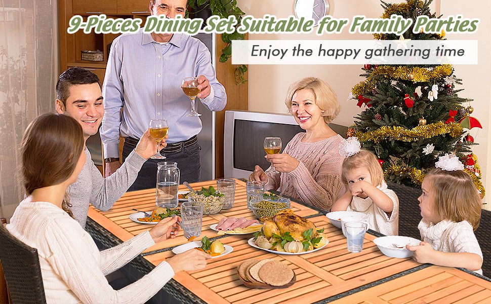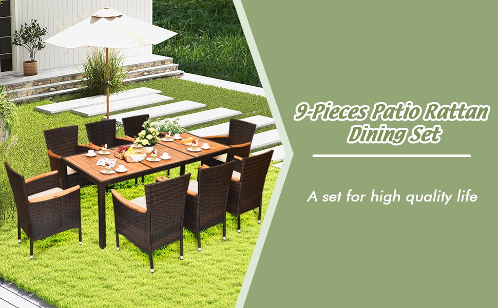 9 Pieces Rattan Dining Set with Acacia Wood Table and Stackable Cushioned Chairs