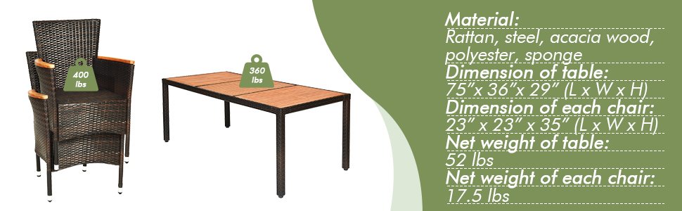 ● Premium Acacia Wood Table: The table top of this patio dining table consists of three acacia panels, which is a highly durable tropical hardwood that is safer than a glass table top, without the worry of breakage. Moreover, with adjustable anti-slip foot pads, this table works well on uneven ground.