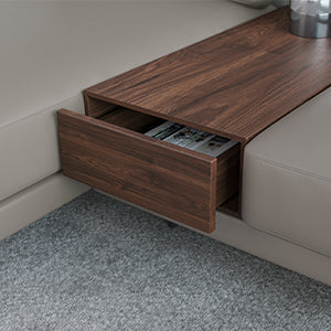 - Includes a walnut veneer storage table with a push-to-open drawer and two elegant throw pillows for added style and practicality.