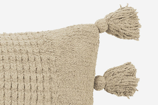 - Covered in a removable, snug microfiber cover braided with playful pom-pom detailing, creating a unique textured look that elevates your décor.
