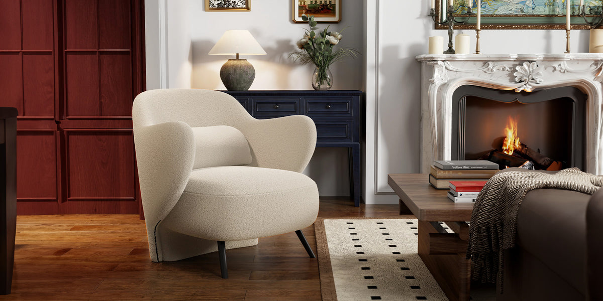 - Upholstered in soft and cozy boucle fabric, adding a touch of texture and luxury to any space.
