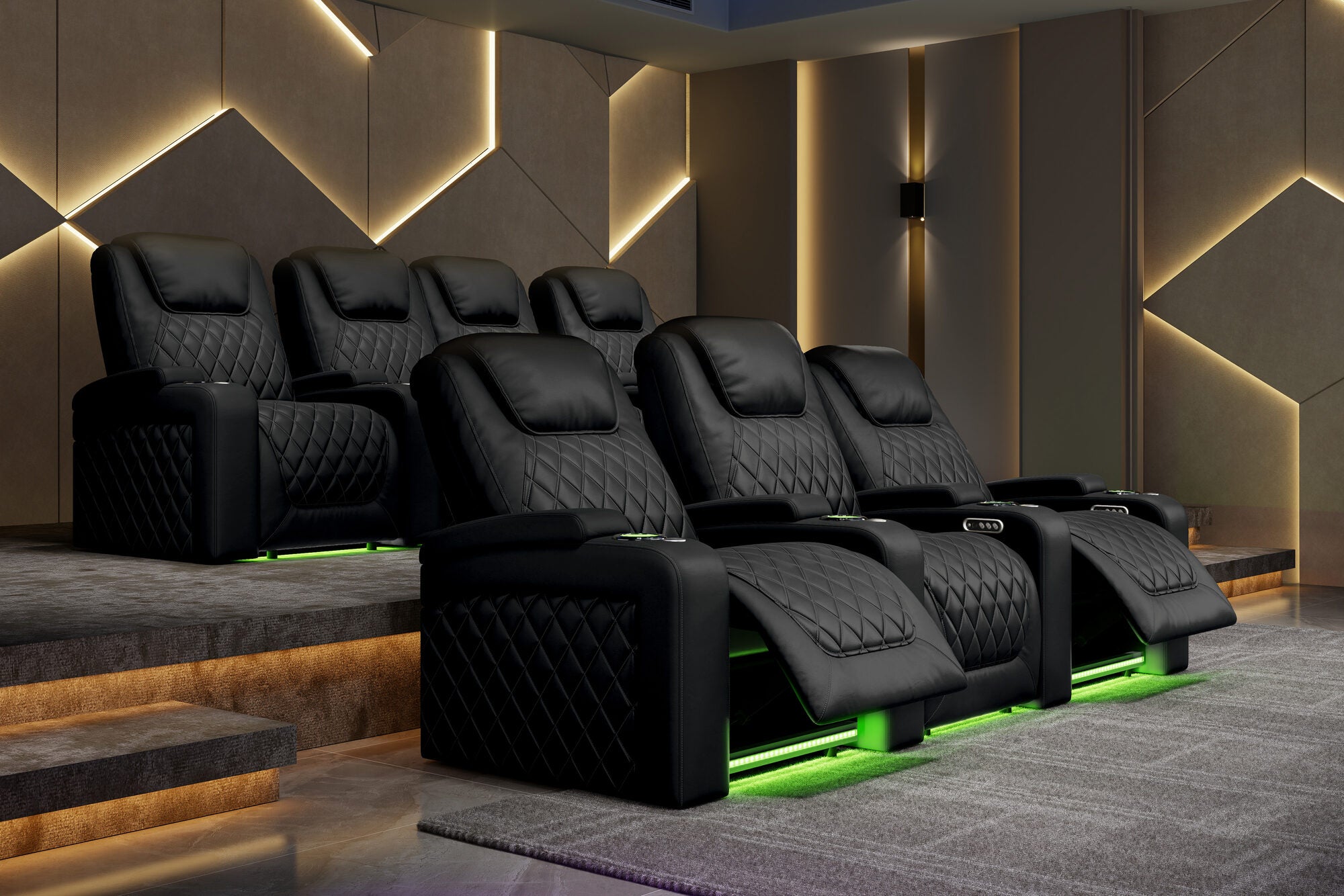 Introducing the 2025 XL Version of Oslo Home Theater Seating! Upgrade your home theater with the brand new Oslo XL 2025 with upgraded technology and cutting-edge comfort, A perfect blend of luxury, style, and comfort. Enjoy immersive movie nights with new RGB cup holders with ambient base lighting, and a motorized reclining system that lets you find your perfect seating position effortlessly. This premium recliner is crafted with new imported Italian Nappa 11000 top grain leather on all seating surfaces, offering a smooth and elegant touch.
