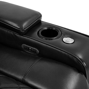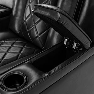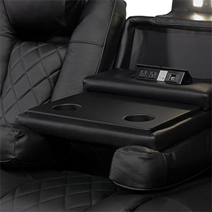 - Center drop-down console includes table, cup holders, and USB ports for added movie-night convenience.