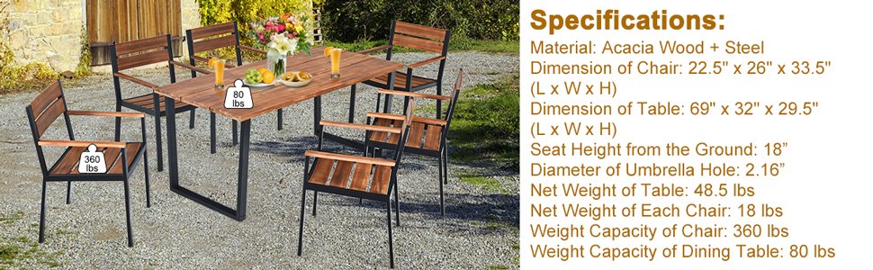 ● Dimension Information: Table size: 69" x 32" x 29.5" (L x W x H), chair size: 22.5" x 26" x 33.5" (L x W x H), armrest height: 25.5", seat height: 18", diameter of umbrella hole: 2.16", chair weight capacity: 360 lbs, table weight capacity: 80 lbs