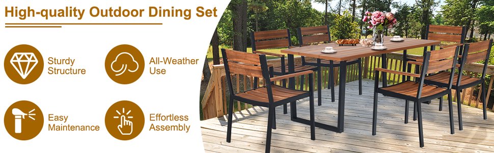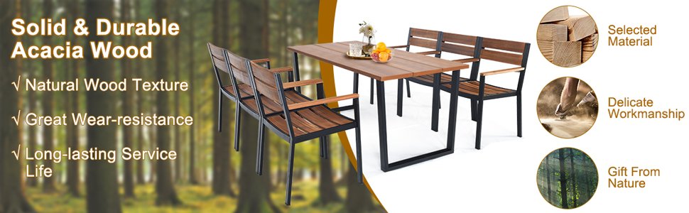 Made of strong acacia wood and metal frame, this patio dining table set can provide an ideal gathering place for you to eat outdoors with your family or friends.