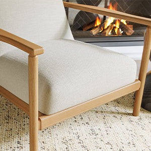 - Soft, neutral-hued upholstery complements the wood frame, creating a seamless fusion of textures and tones.