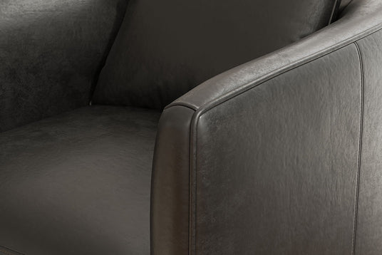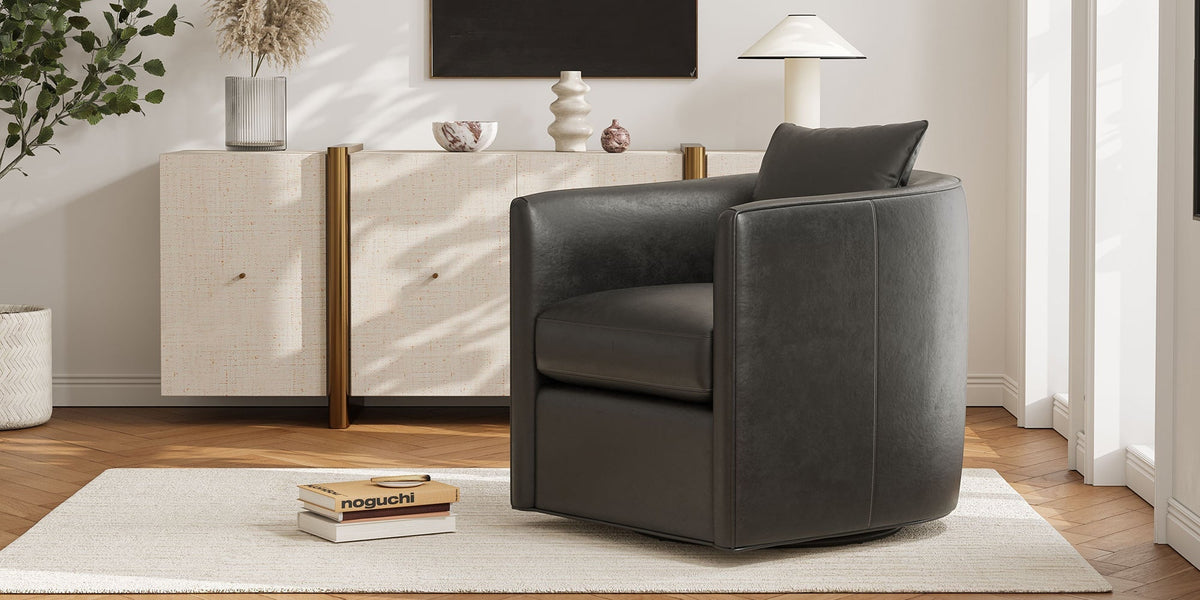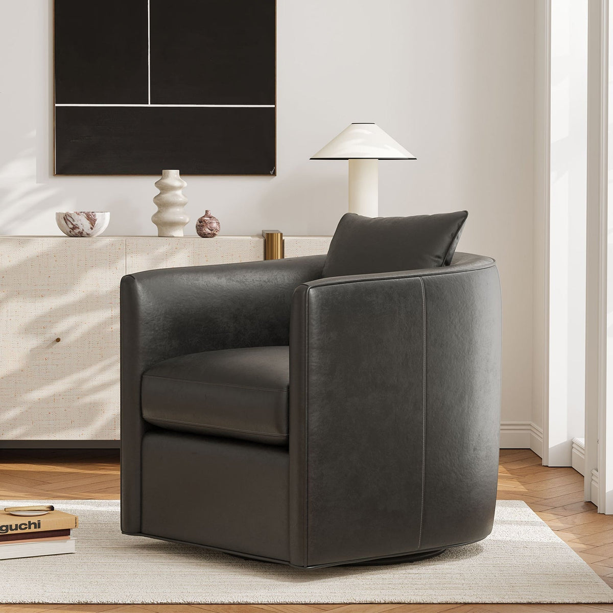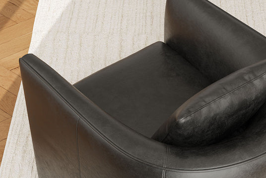Expertly crafted with precise detailing, the Riley swivel chair boasts a dynamic presence. Its design features a welcoming barrel-shaped back, offering a cozy embrace. The chair is luxuriously furnished with a soft, cushioned seat for added comfort. Its compact yet elegant proportions make it ideal for pairing or grouping, enhancing the functionality and style of small apartments, media spaces, or intimate conversation areas in a living space.