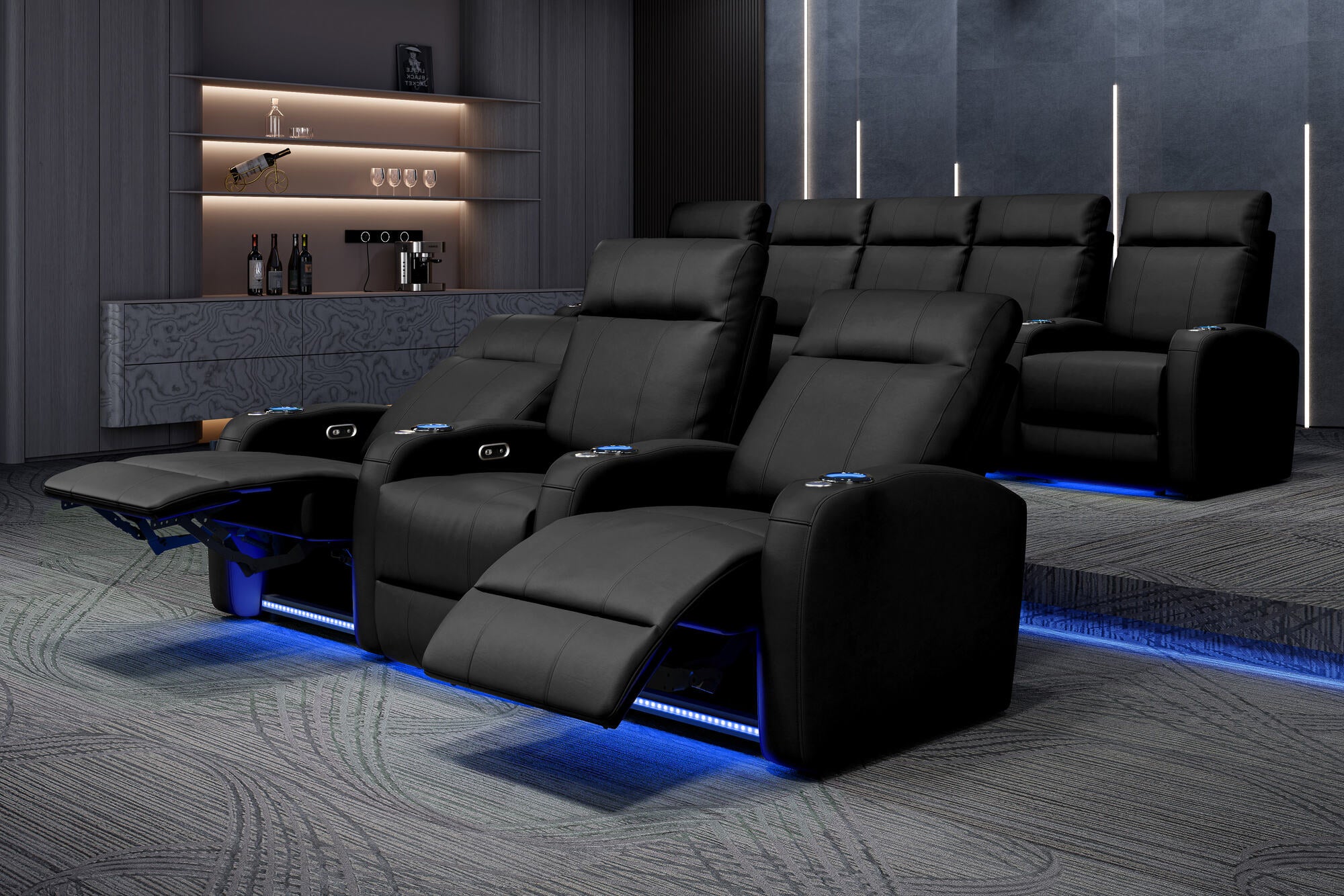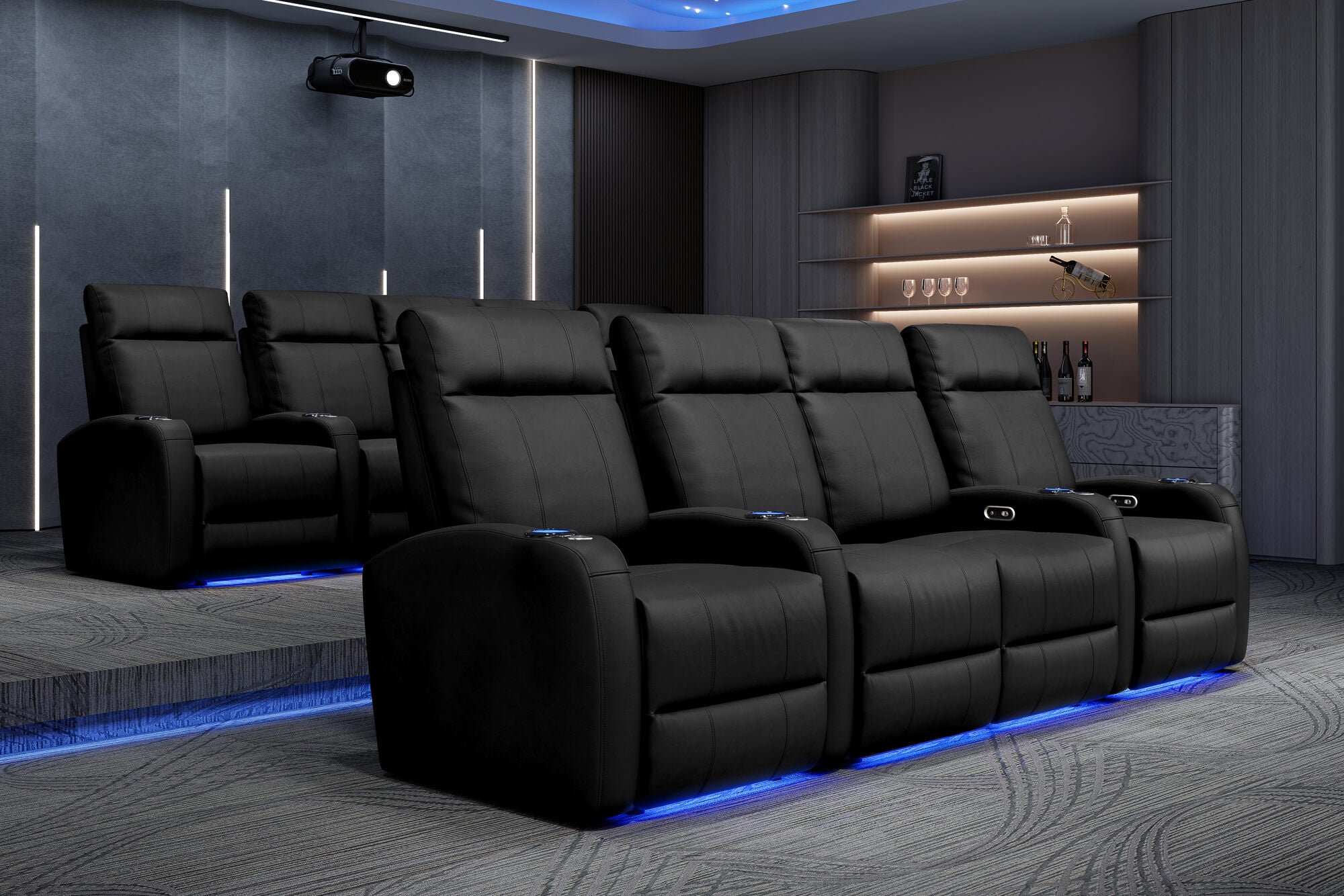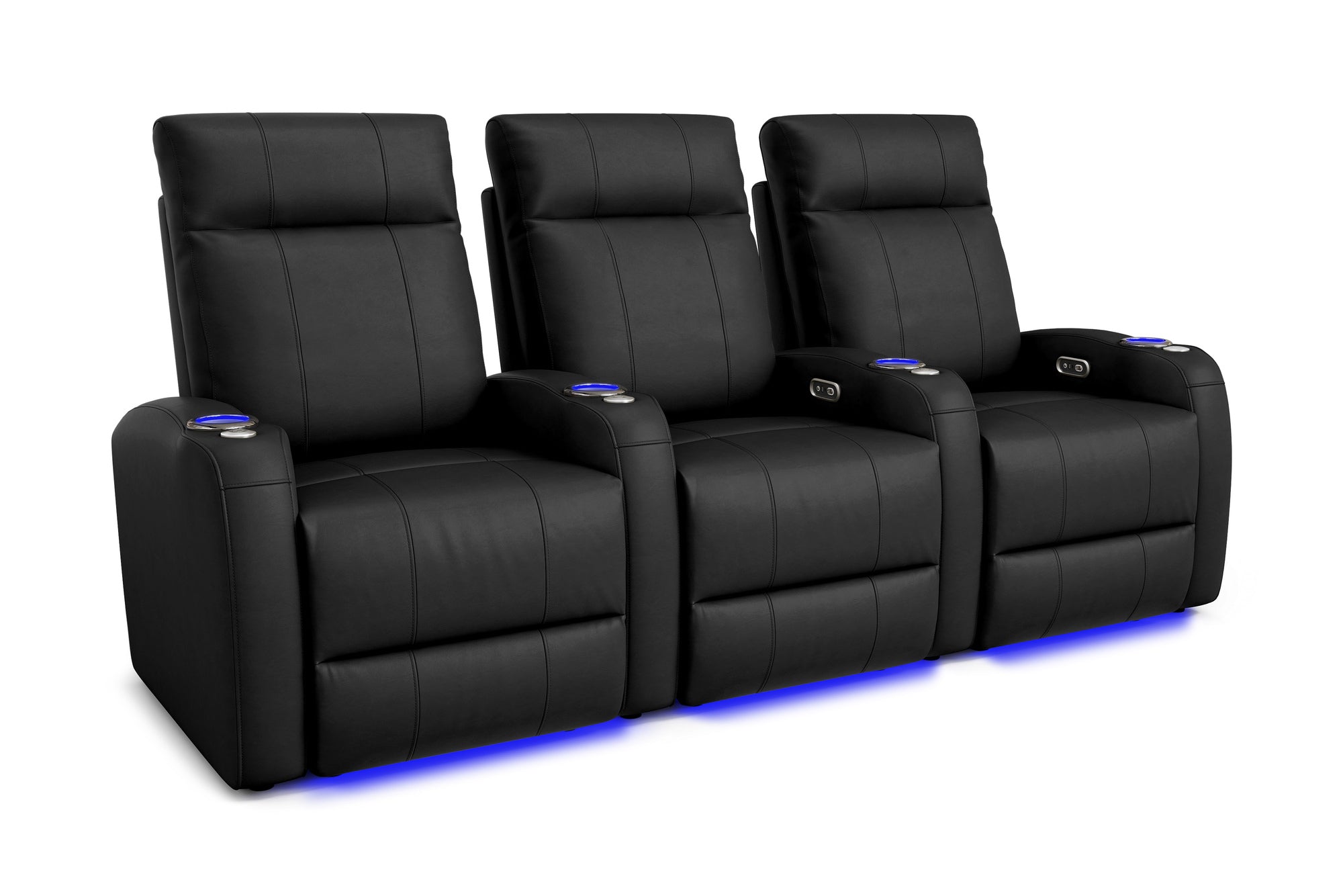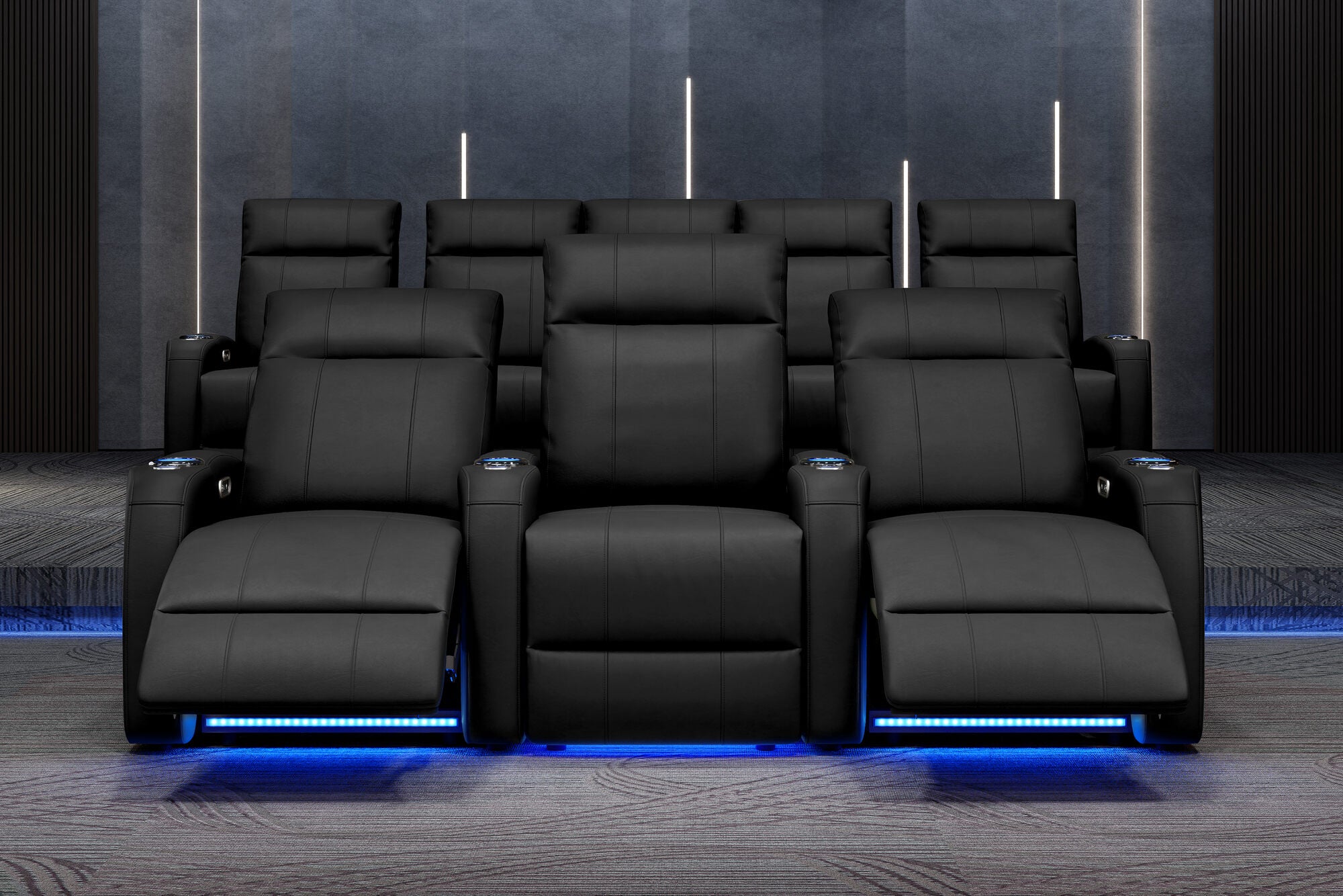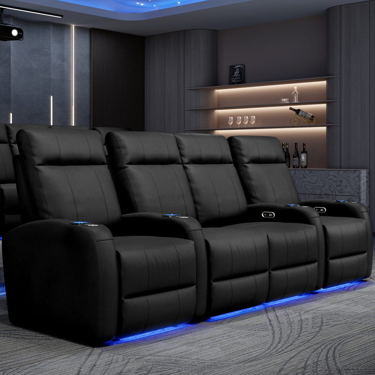 Incredibly sleek, slim, and comfortable, the 2025 Version of Syracuse is designed to give you plenty of space in your home cinema without sacrificing comfort. The 2025 Syracuse reclining home theater chairs comes with LED cup-holders, ambient base lighting, premium top grain 9000 leather on all seating surfaces, and motorized recliner mechanisms. The 2025 New Syracuse will immerse you into your viewing experience like no other leather-upholstered theater chair has before.
