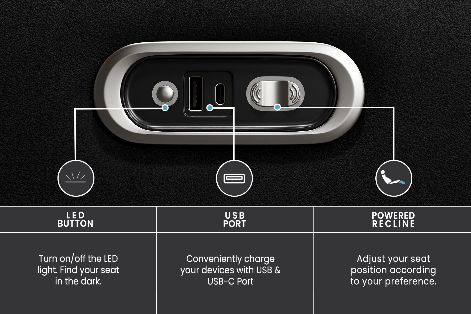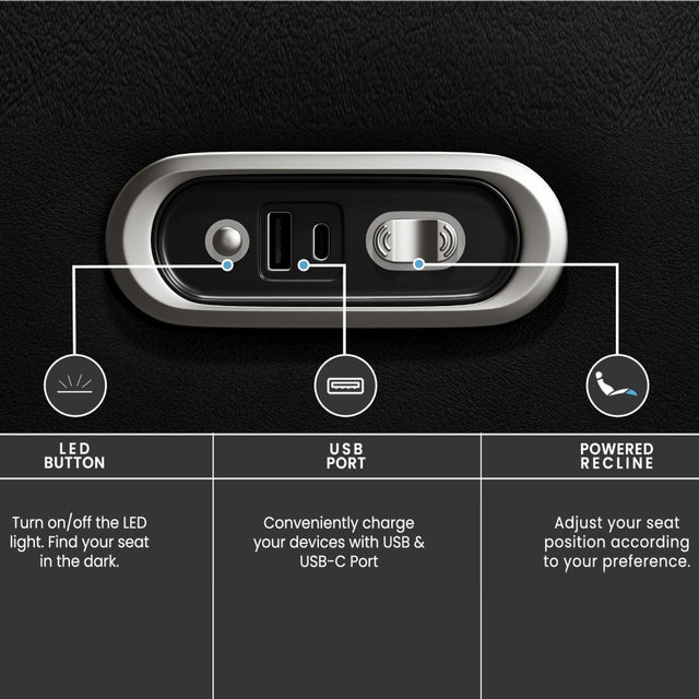 - The newly enhanced 2025 control panel includes USB-A and upgraded 18W Light Speed USB-C charging ports for fast, convenient device charging right from your seat.