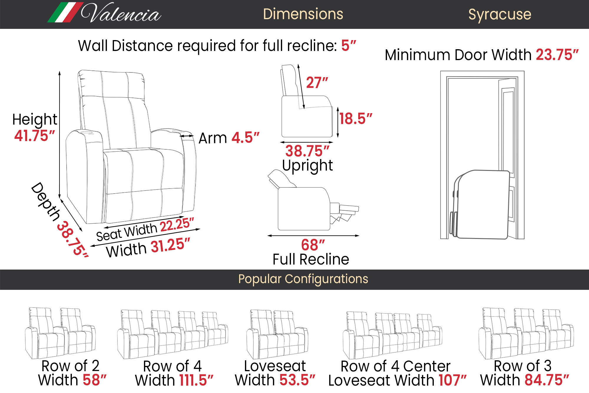 Incredibly sleek, slim, and comfortable, the Syracuse is designed to give you plenty of space in your home cinema without sacrificing comfort. The Syracuse reclining home theater chairs comes with LED cup-holders, ambient base lighting, premium Italian Nappa 9,000 Top Grain Grade Leather on all seating surfaces, and motorized recliner mechanisms. The Syracuse will immerse you into your viewing experience like no other leather-upholstered theater chair has before. Customize to your liking with premium leather theater chairs in a row of 4 or 5, or get chairs that seat 3 or 2 people—with our entertainment room furniture, the choice is yours.