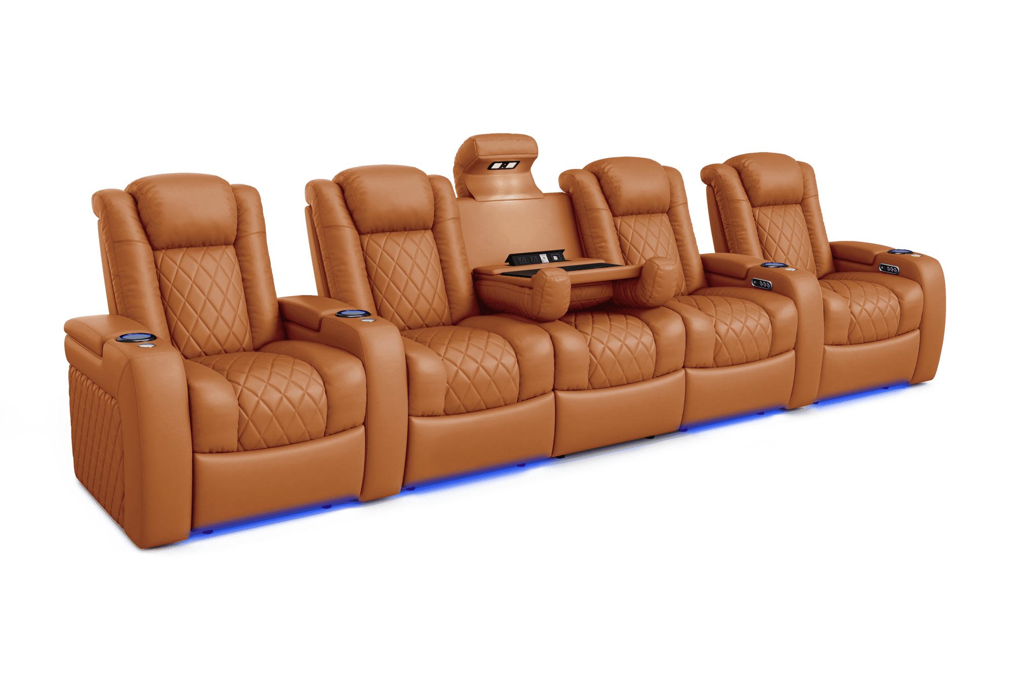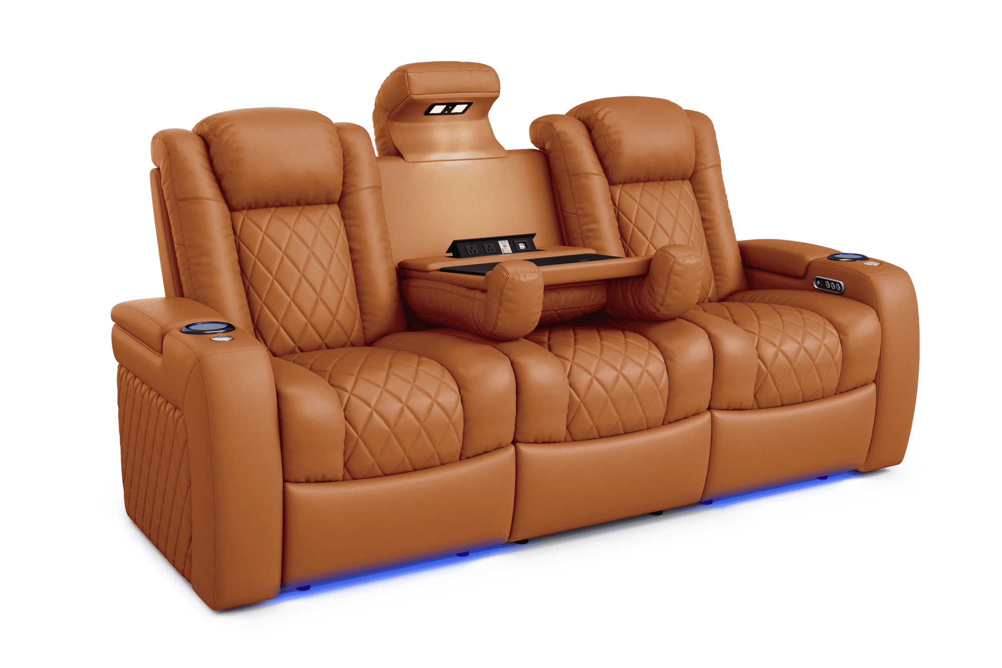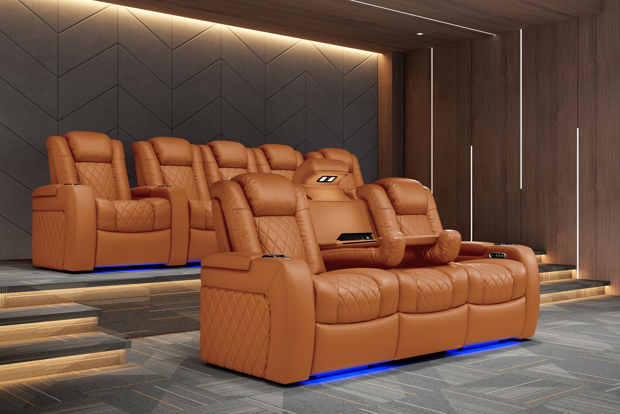 Introducing the Tuscany Console Home Theater Seating! Upgrade your home theater with the brand new Tuscany Console with upgraded technology and cutting-edge comfort, A perfect blend of luxury, style, and comfort. Enjoy immersive movie nights with new RGB cup holders with ambient base lighting, and a motorized reclining system that lets you find your perfect seating position effortlessly.