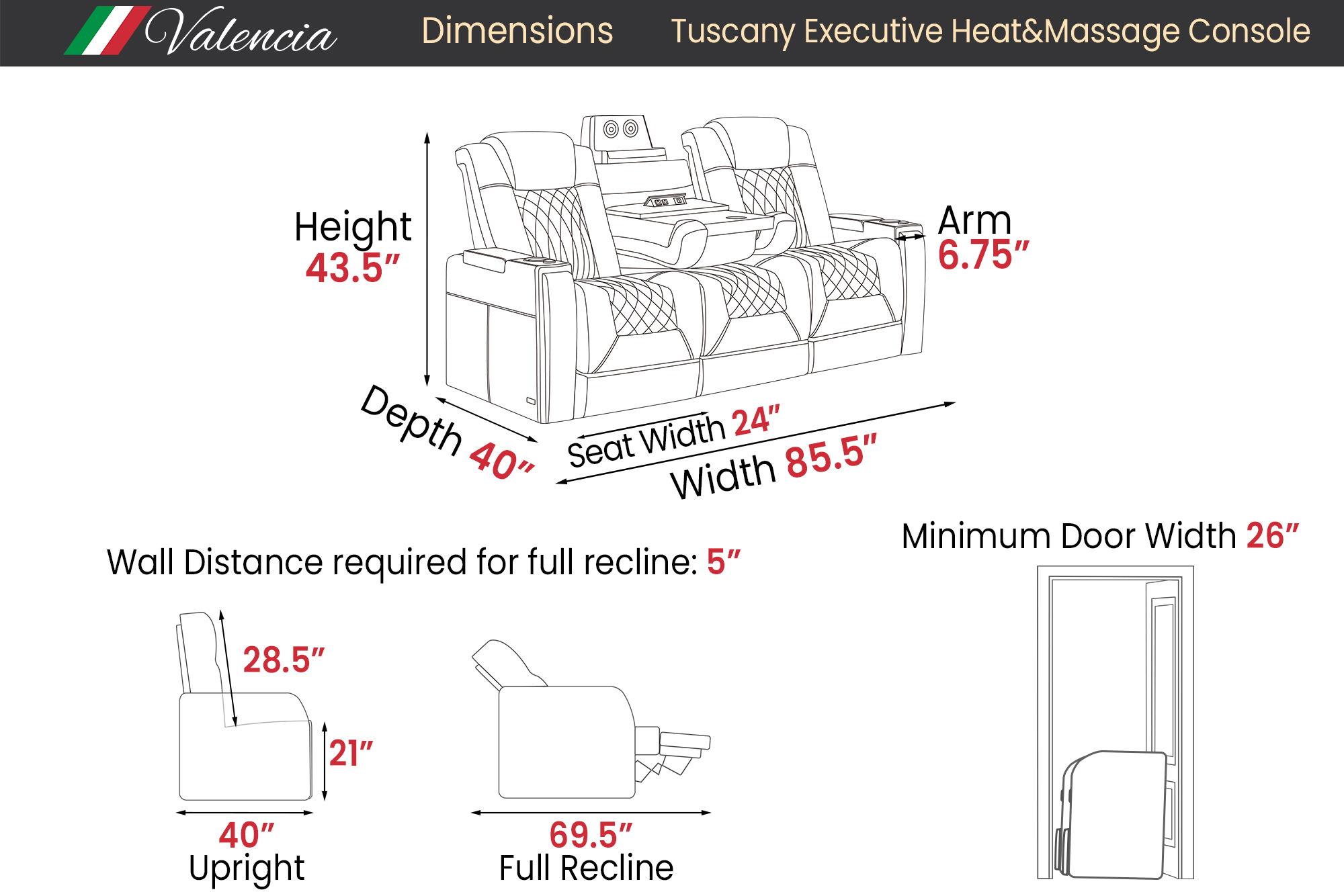 Introducing the 2025 New Tuscany Executive Console Home Theater Seating! Upgrade your home theater with the brand new Tuscany Executive Console with upgraded technology and cutting-edge comfort, A perfect blend of luxury, style, and comfort. This premium recliner is crafted with new imported Italian Nappa 11000 top grain leather on all seating surfaces, offering a smooth and elegant touch. Indulge in the pinnacle of luxury with Valencia’s 2025 Tuscany Executive Console model, now enhanced with heated massage functions on both end seats and a centre console designed to hold your favourite wine and gourmet platter.
