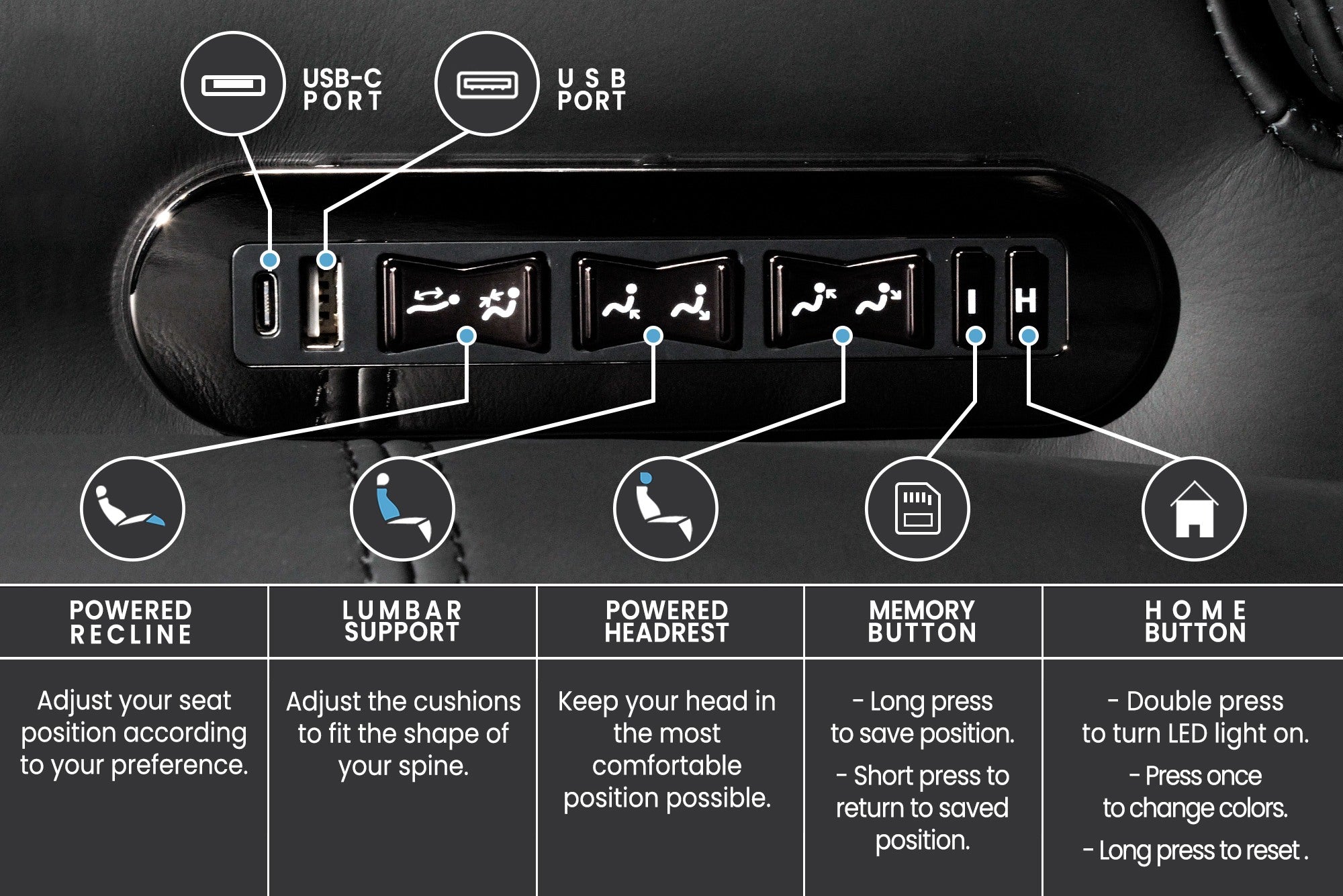 - RGB LED lighting (7 colors) and Seat Memory.