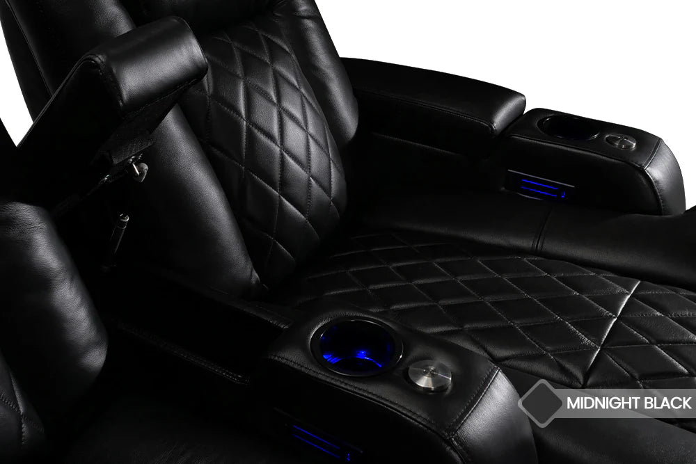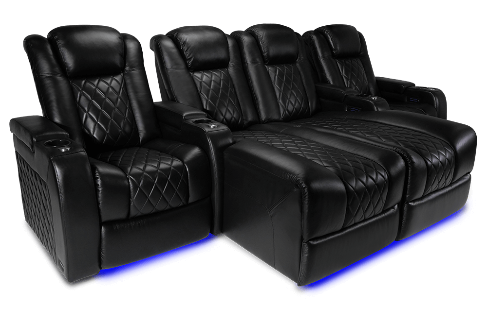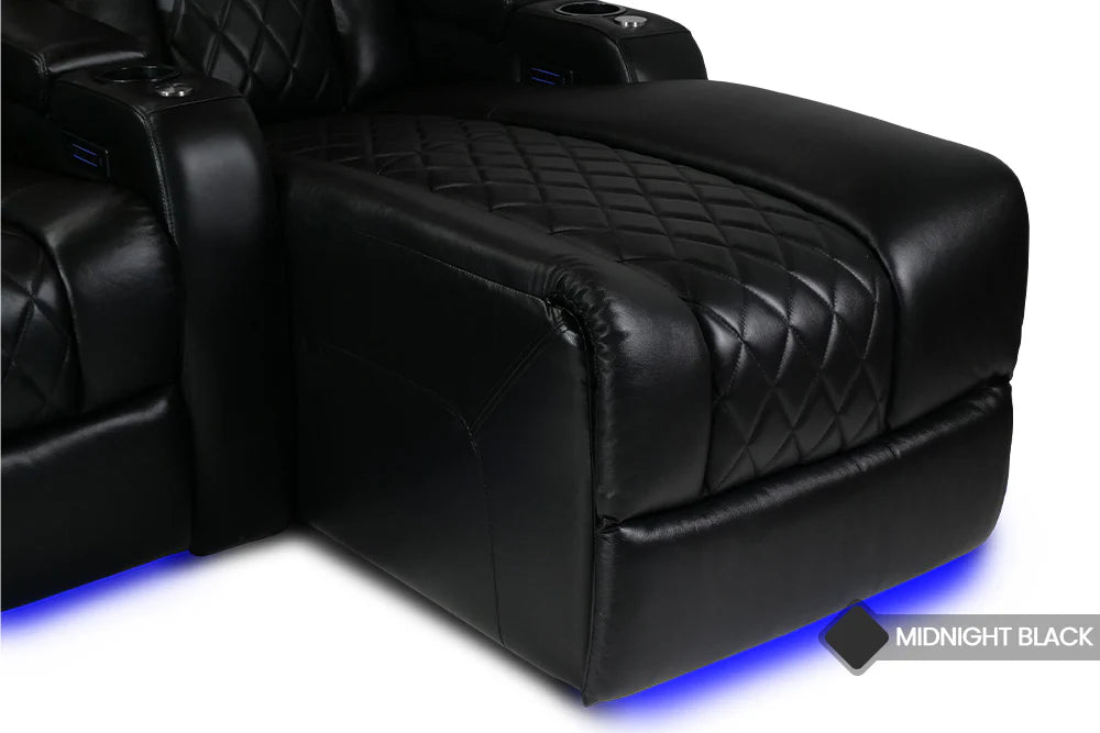 An extension of our Tuscany design, the Tuscany Chaise offers extended comfort to maximize your lounging experience. Kick back and relax with the option to fully sprawl out. Pair that with the power headrest, lumbar support & recline, and you’ve got yourself the ideal luxury sectional. With a diamond-stitch design and other premium features, this home theater seating set is your one way ticket to luxury. The configuration offers a mixture of standard Tuscany seating with the chaise located on the outer seating, or standard seating with the chaise in the centre of the configuration. With a unique combination of style, comfort, and luxury, the Tuscany Chaise makes it possible to get the most out of your movie nights with friends and family.