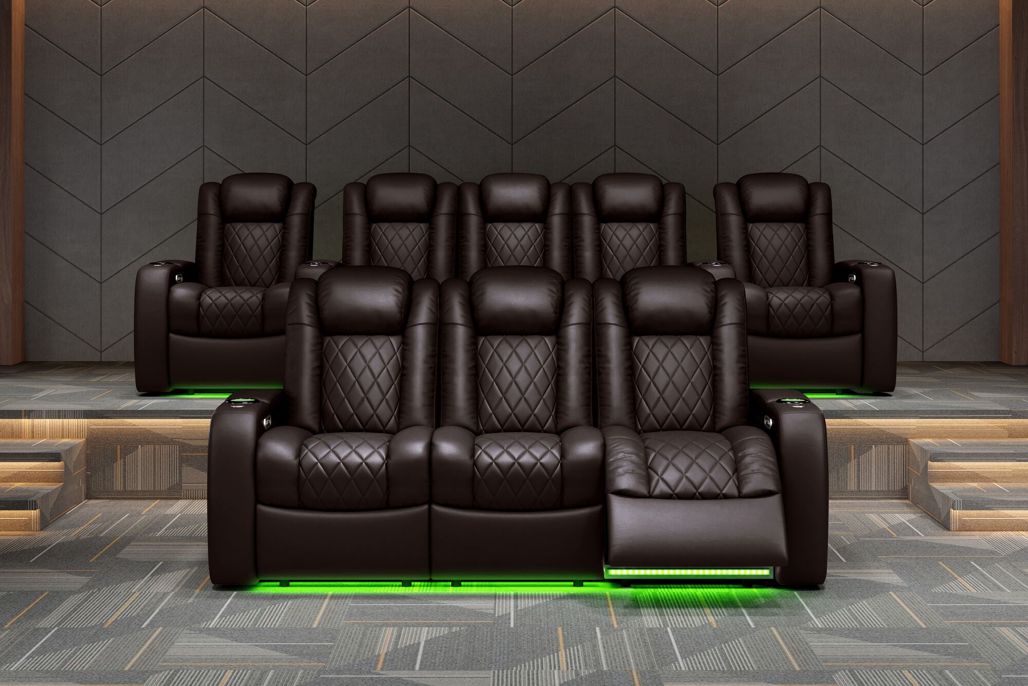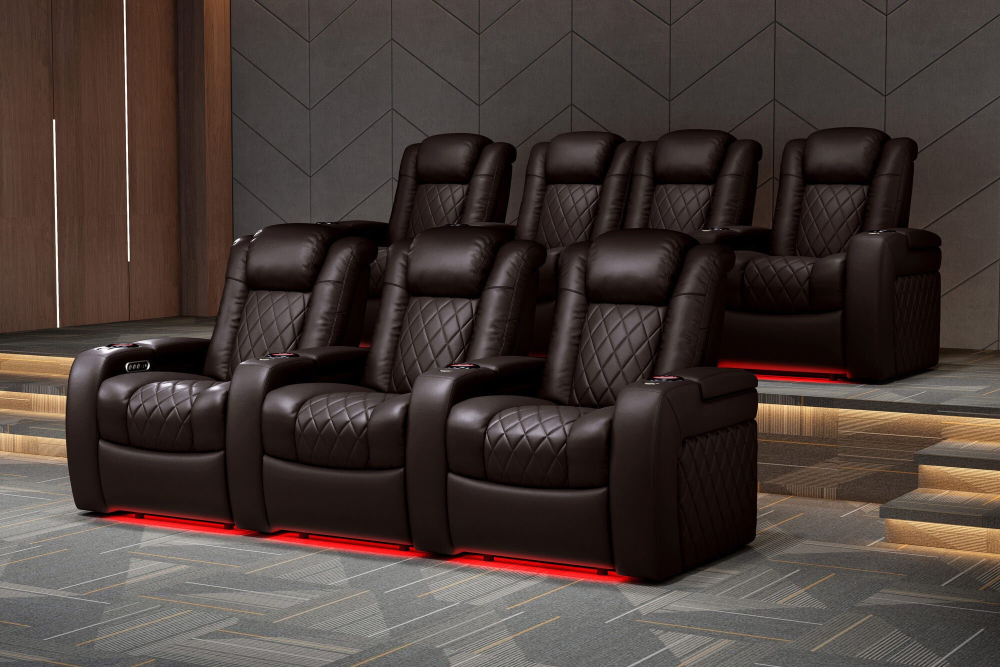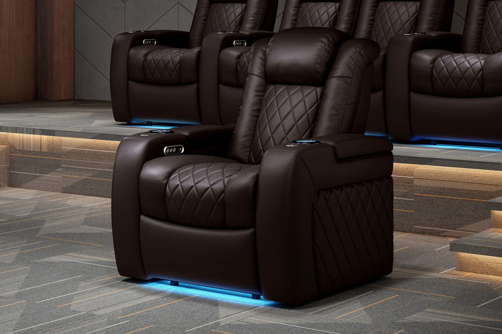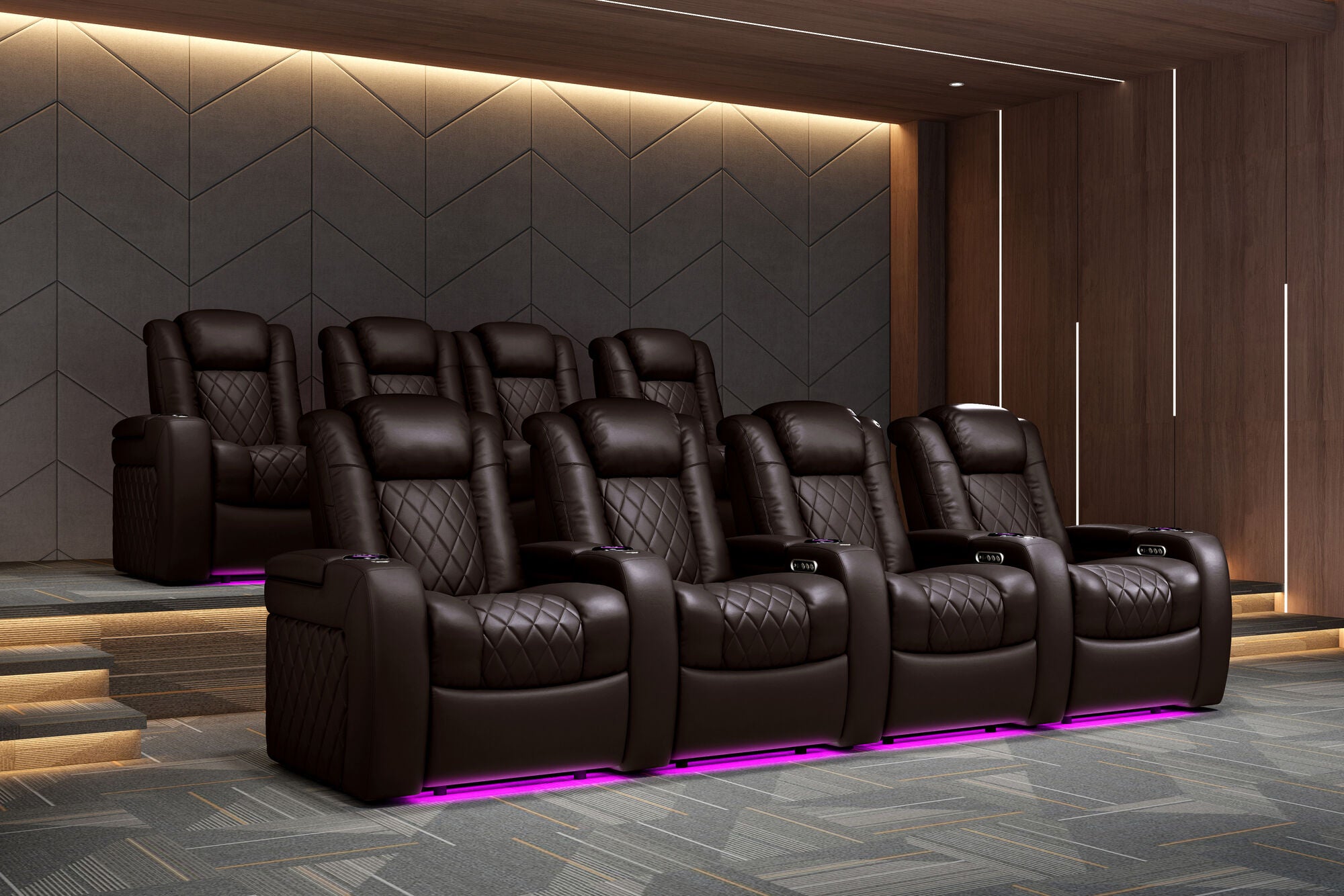 Introducing the 2025 Version of Our Best-Selling Tuscany Home Theater Seating! Upgrade your home theater with the brand new Tuscany 2025 with upgraded technology and cutting-edge comfort, A perfect blend of luxury, style, and comfort. Designed for unmatched relaxation, this premium recliner is crafted with new imported Top-Grain Italian Nappa leather 11000 on all seating surfaces, offering a smooth and elegant touch. Enjoy immersive movie nights with new RGB cup holders with ambient base lighting, and a motorized reclining system that lets you find your perfect seating position effortlessly. The newly upgraded Tuscany now features deeper hidden arm storage, perfect for keeping your accessories close at hand. Plus, an air piston-assisted storage lid ensures smooth and safe operation. Our tactile button control system replaces traditional soft-touch buttons, allowing you to activate all functions simultaneously for an enhanced experience.