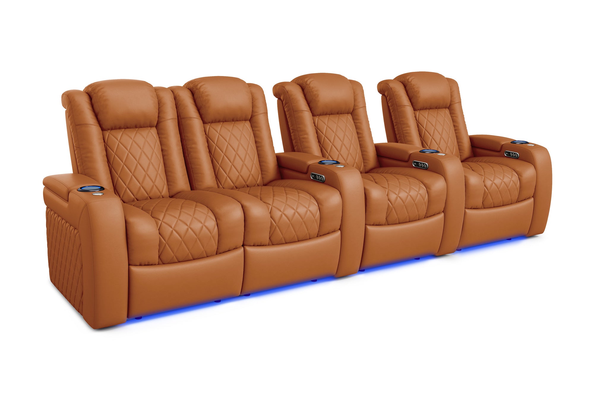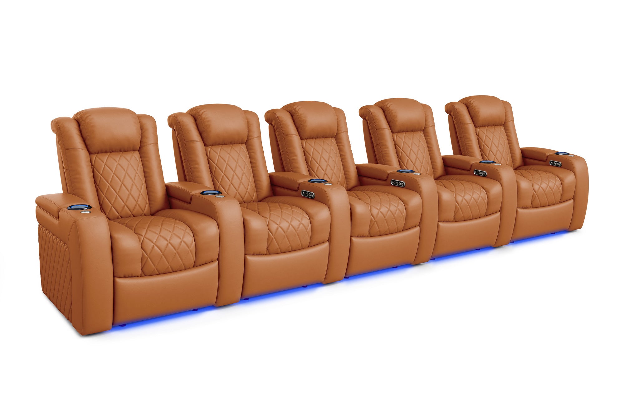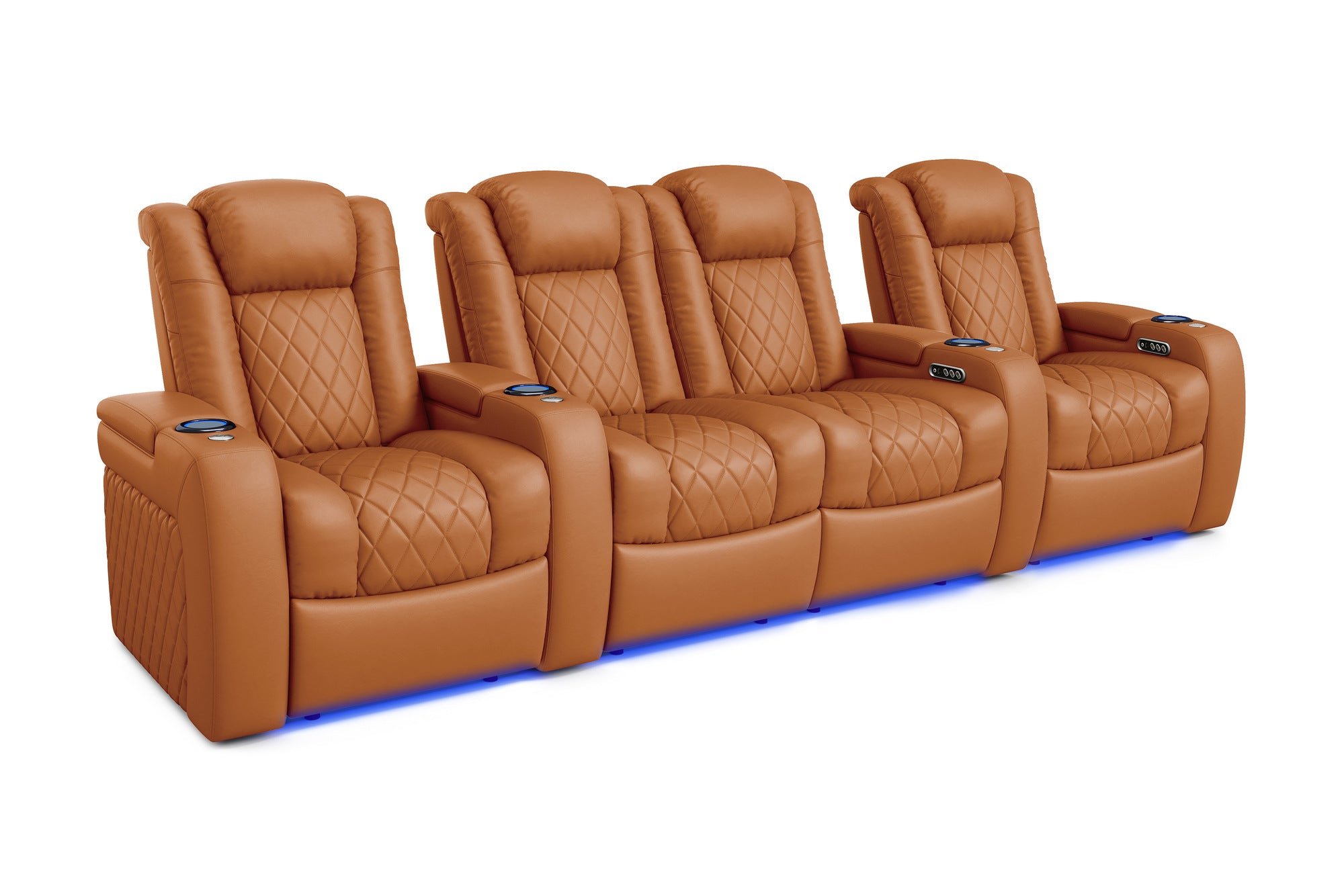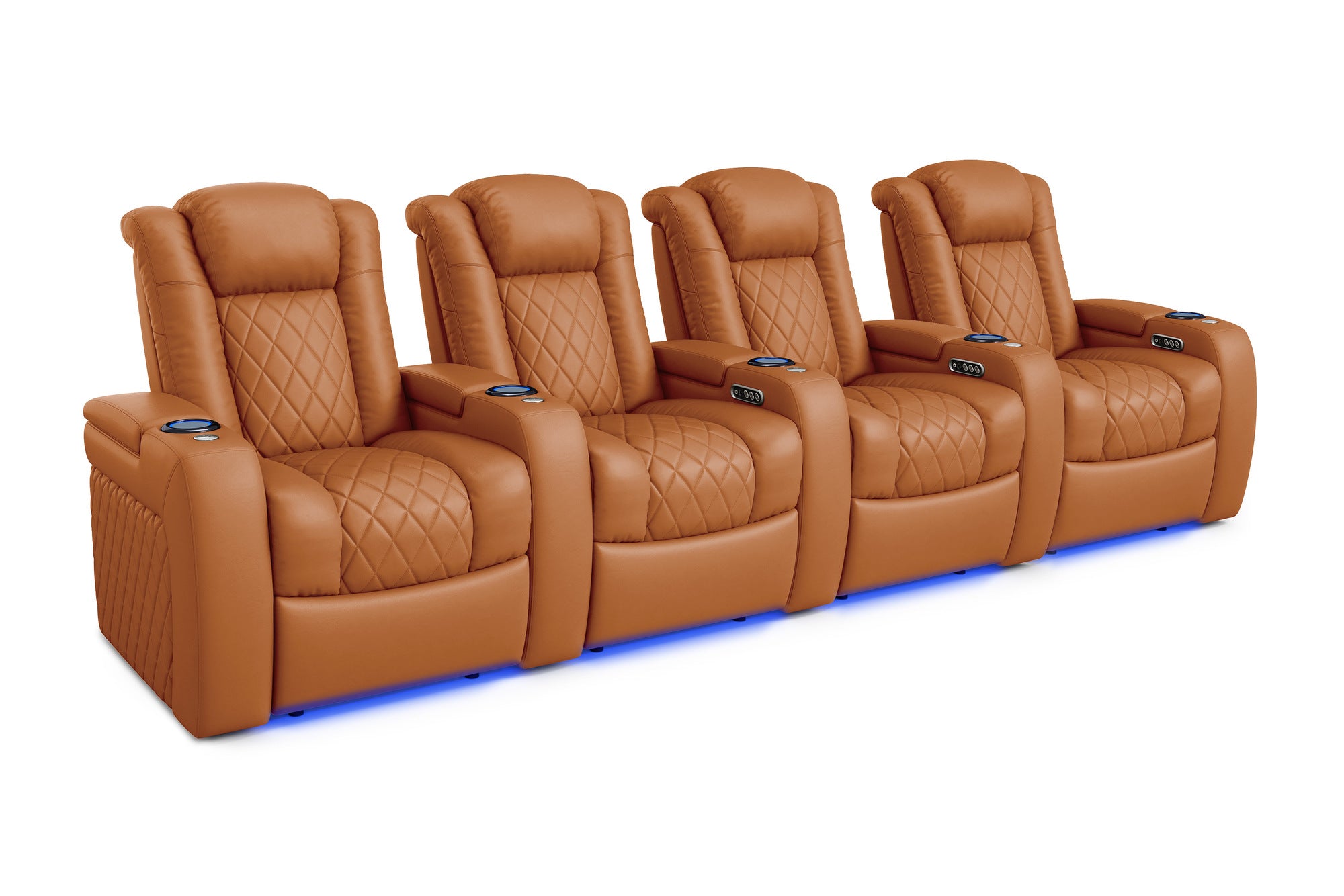 Introducing the 2025 Version of Our Best-Selling Tuscany Home Theater Seating! Upgrade your home theater with the brand new Tuscany 2025 with upgraded technology and cutting-edge comfort, A perfect blend of luxury, style, and comfort. Designed for unmatched relaxation, this premium recliner is crafted with new imported Top-Grain Italian Nappa leather 11000 on all seating surfaces, offering a smooth and elegant touch. Enjoy immersive movie nights with new RGB cup holders with ambient base lighting, and a motorized reclining system that lets you find your perfect seating position effortlessly. The newly upgraded Tuscany now features deeper hidden arm storage, perfect for keeping your accessories close at hand. Plus, an air piston-assisted storage lid ensures smooth and safe operation. Our tactile button control system replaces traditional soft-touch buttons, allowing you to activate all functions simultaneously for an enhanced experience.