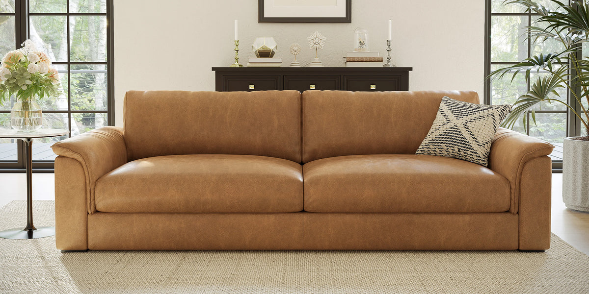 Discover the perfect blend of refined elegance and timeless comfort with our Zaira sofa. Crafted to exude simple sophistication, this designer-inspired piece boasts luxurious aniline leather enveloping every inch of its frame. Sink into its plush cushions and relish in the inviting embrace of its wide armrests adorned with premium fiber fill pillows. With its generous proportions and rustic leather upholstery, the Zaira sofa effortlessly embodies a casual, lived-in charm. Embrace the familiarity of its design while appreciating its heirloom quality, destined to age gracefully over time.